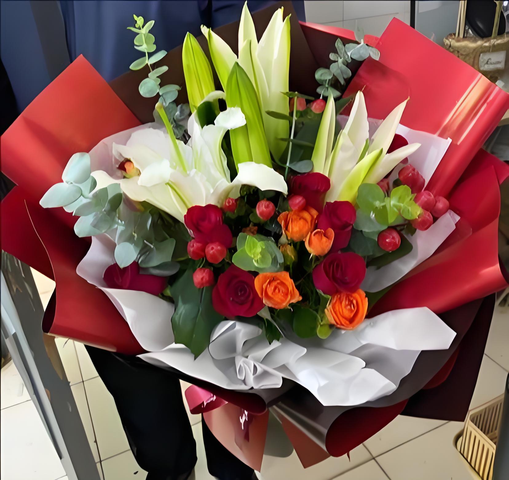 洛阳花店包11枝红玫瑰、2枝多头白百合、6枝橙色多头玫瑰、红豆、尤加利叶